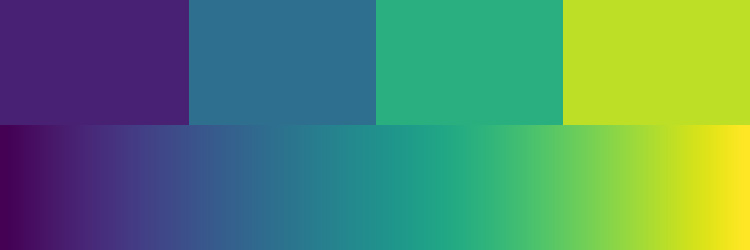 Viridis je sekvenčna barvna paleta, ki prehaja iz temno modre → turkizne → zelene → rumeno. Ključna lastnost pa je ta, da sprememba barve ustreza enakomerni spremembi vrednosti. To pomeni, da uporabnik ne vidi “lažnih poudarkov” ali nenadnih preskokov, kot se pogosto zgodi pri starejših paletah (npr. rainbow).